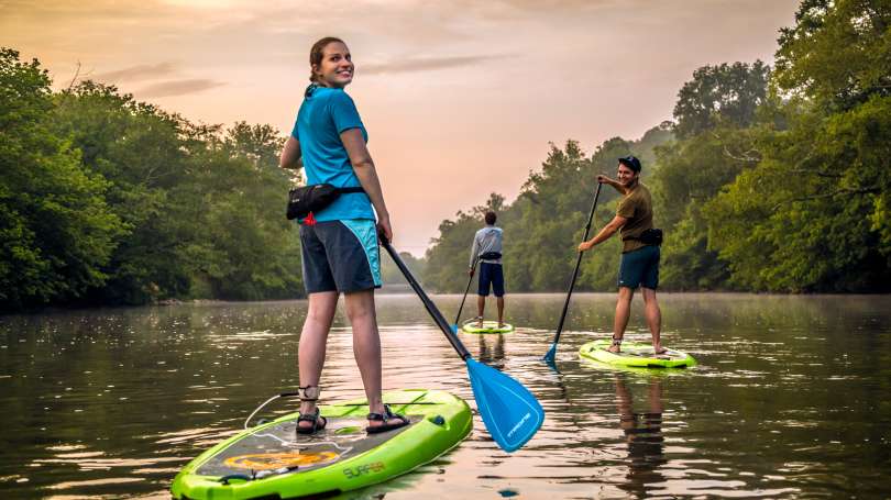 Asheville Outdoor Center and other outdoor companies offer standup paddleboarding (SUP) lessons, something Donnell highly recommends.
