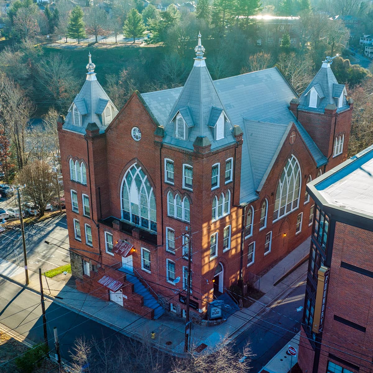 This is the third of four churches built in the downtown area of Asheville by the James Vester Miller & Sons Construction Company. Biltmore architect Richard Sharp Smith also designed this building, and it was completed in 1919. Featuring elements of the Gothic Revival style of most of the churches built at this time, its interior includes a 50-pipe organ built by A.B. Felgemaker of Erie, PA, and a spectacular stained glass window on the east side. The church was renovated during the first decade of the 21st century
